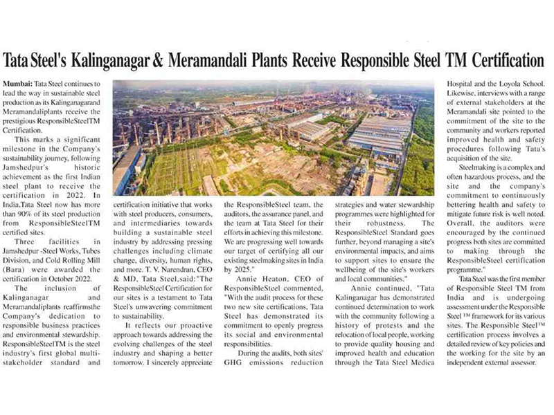 Tata Steel’s Kalinganagar and Meramandali plants receive ResponsibleSteelTM Certification