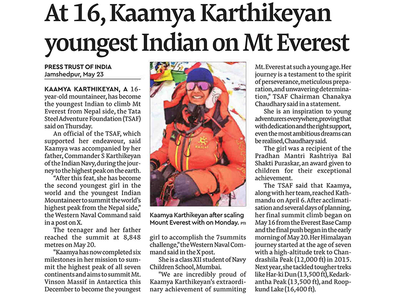 16-year-old mountaineering star Kaamya Karthikeyan triumphs Mt Everest