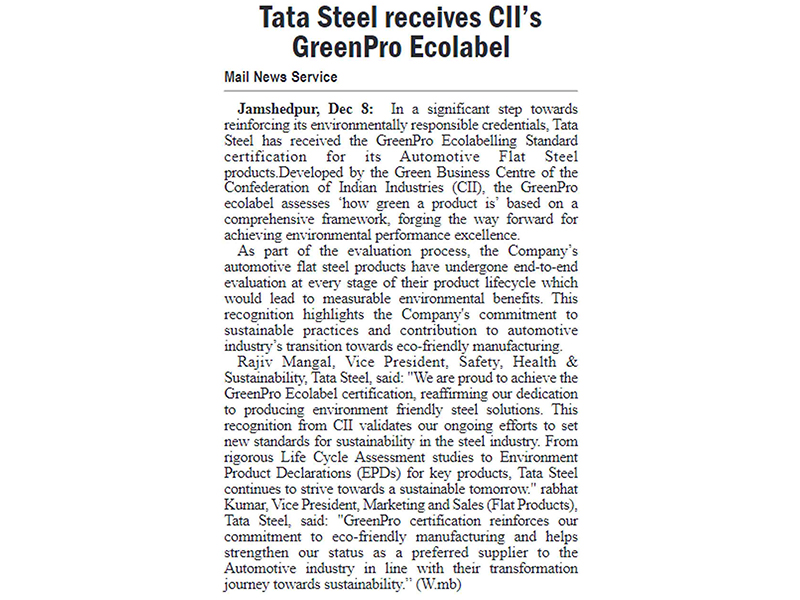 Tata Steel receives Cll's Greenpro Ecolabel