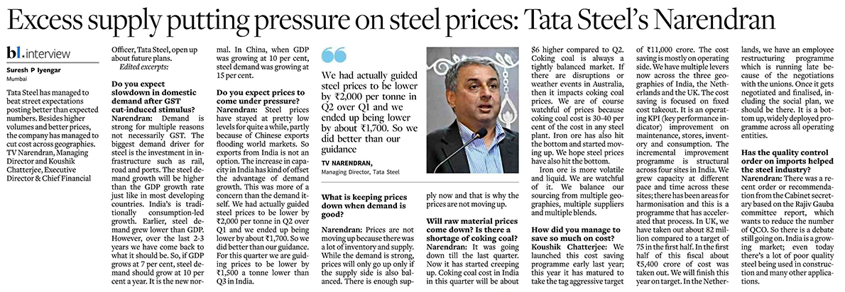Excess supply putting pressure on steel prices: Tata Steel's Narendran