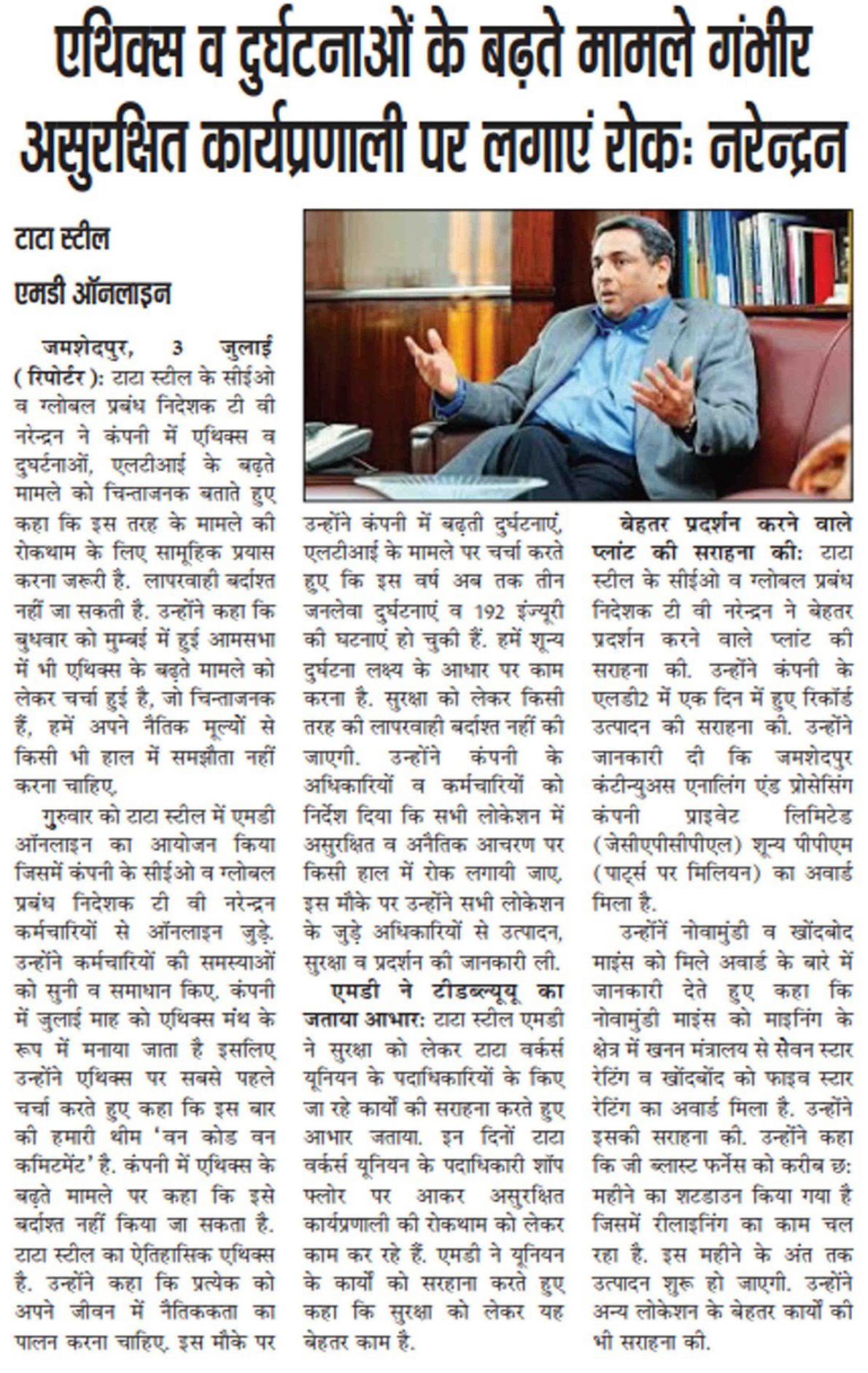Increasing cases of ethics and accidents are serious, stop unsafe working practices: Narendran