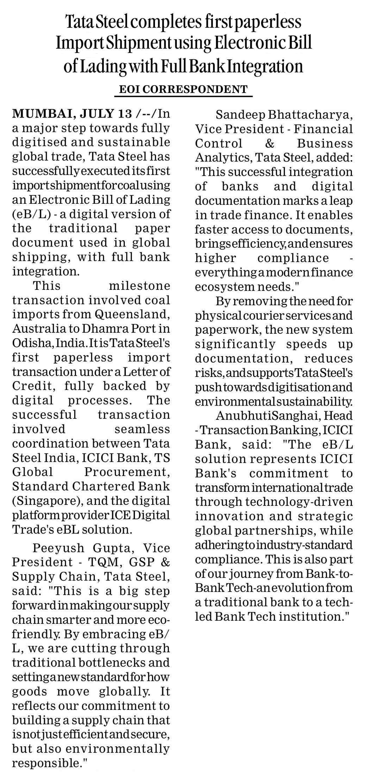 Tata Steel completes first paperless Import Shipment using Electronic Bill of Lading with Full Bank Integration