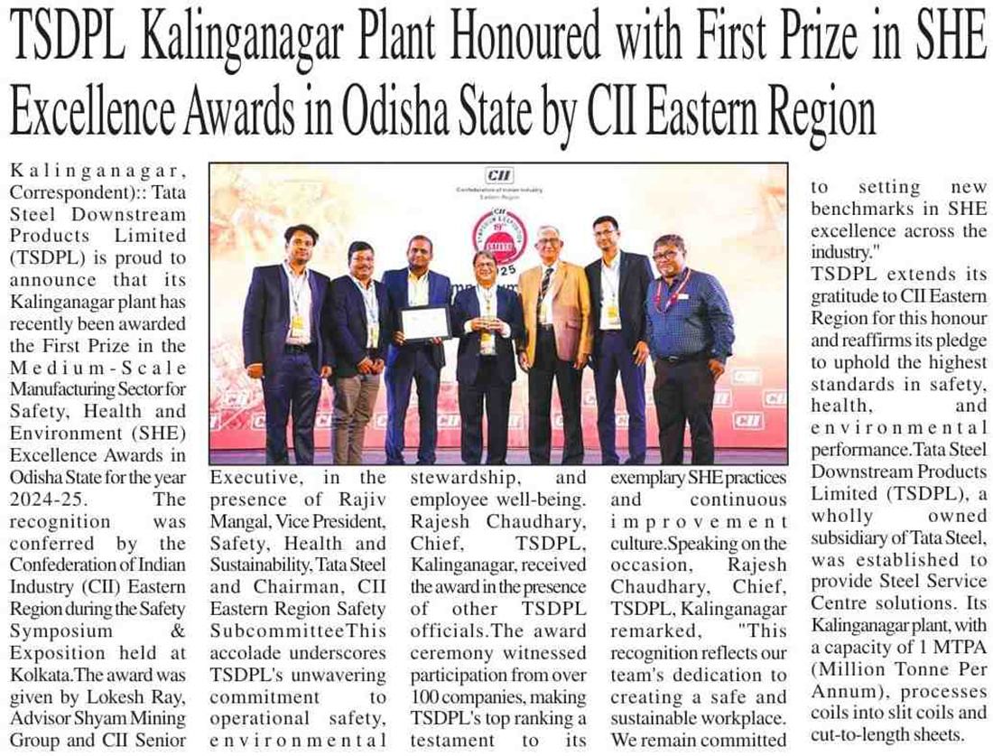 Tata Steel Downstream Products Limited (TSDPL) Kalinganagar Plant Honoured with First Prize in SHE Excellence Awards in Odisha State by CII Eastern Region