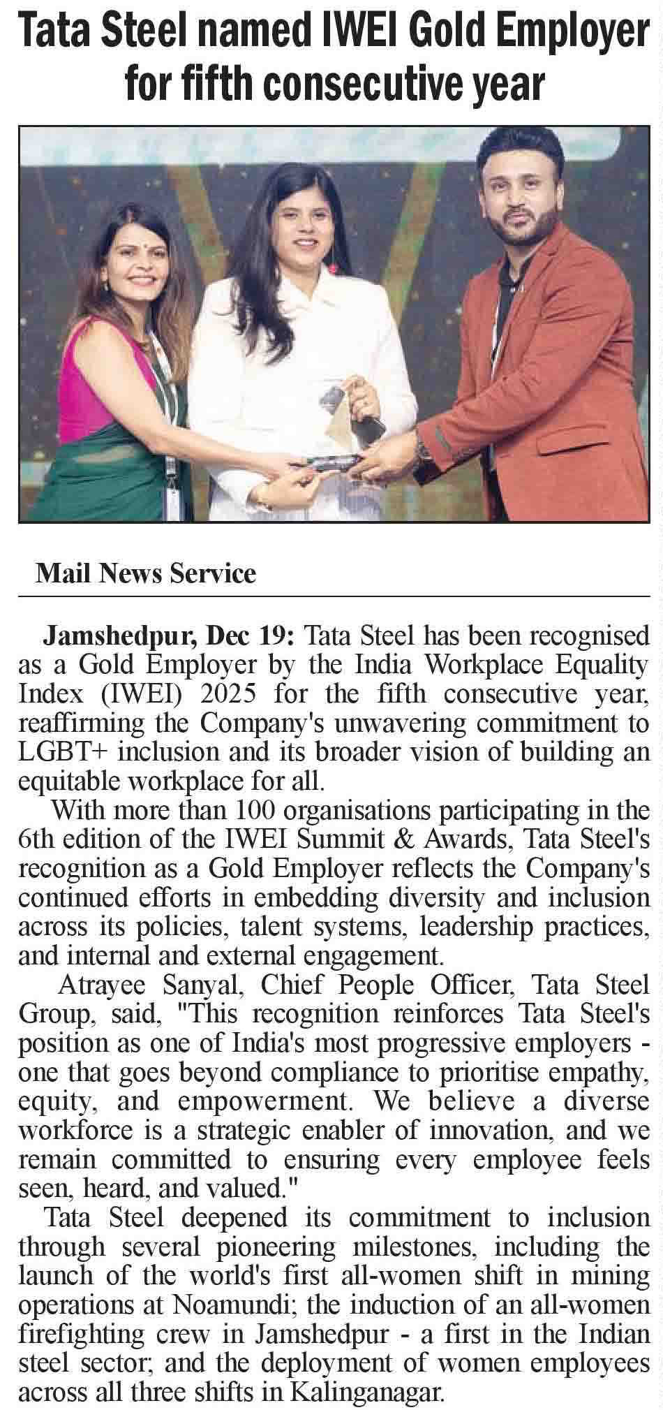 Tata Steel named IWEI Gold Employer for fifth consecutive year