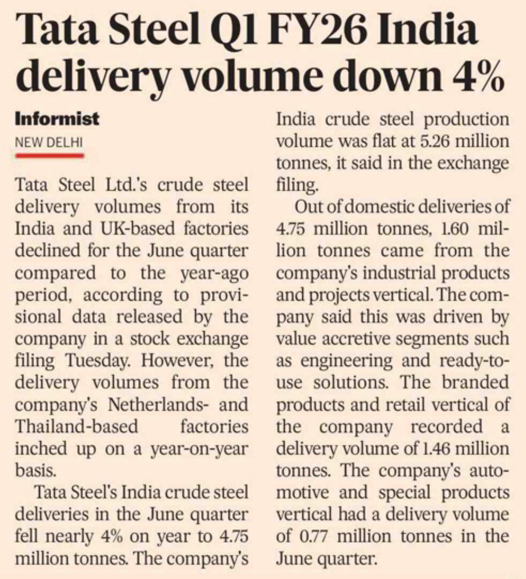 Tata Steel Q1 FY26 India delivery volume down 4%