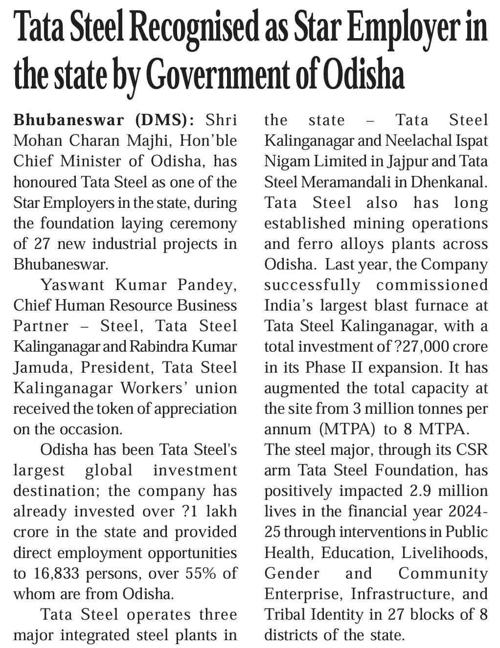 Tata Steel Recognised as Star Employer in the state by Government of Odisha