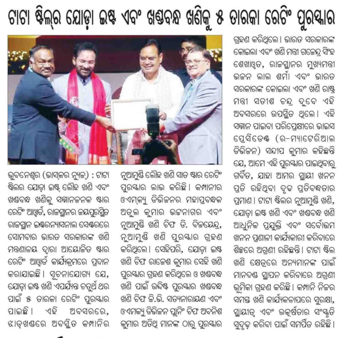 Tata Steel’s Noamundi, Joda East and Khondbond Mines Receive Star Rating Awards for Sustainable Practices