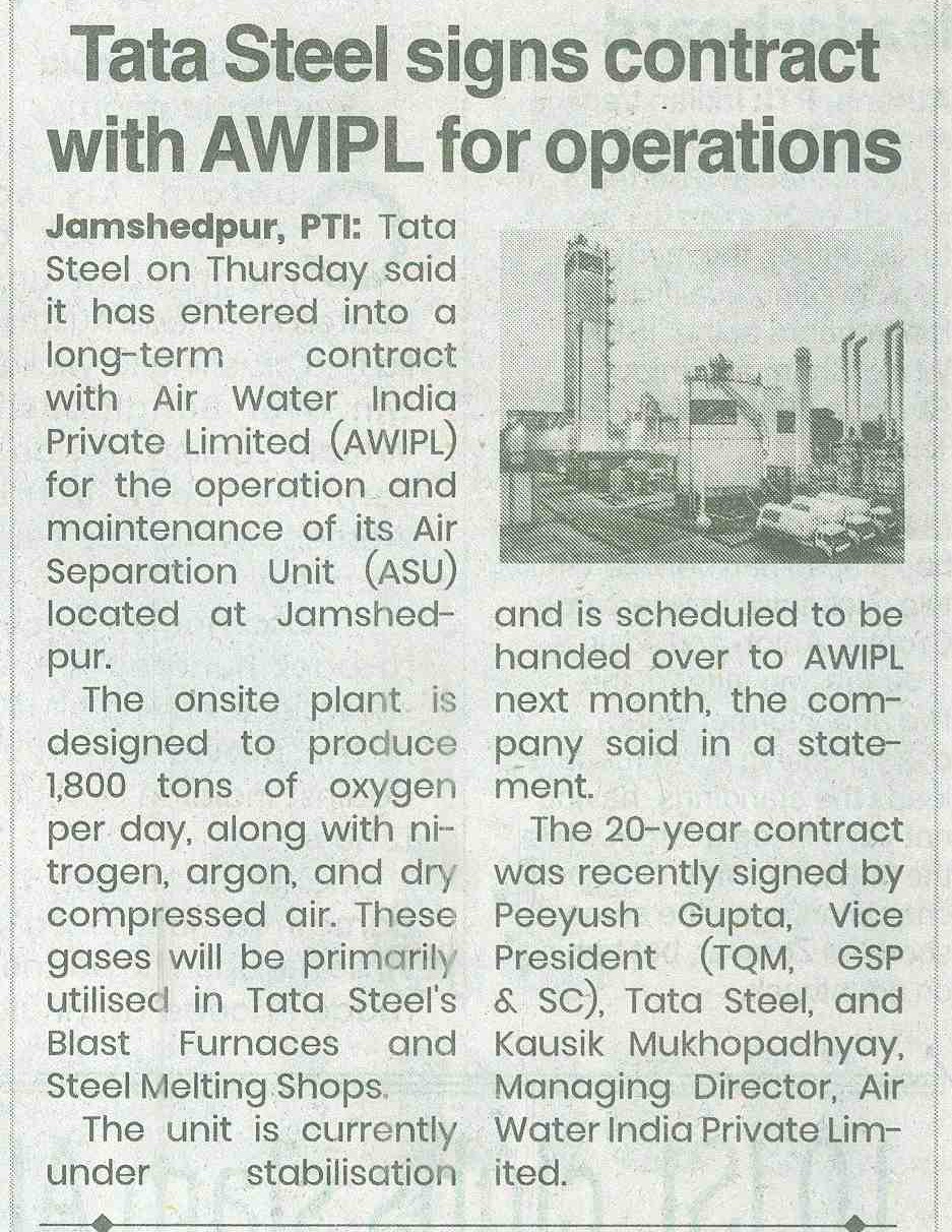 Tata Steel signs contract with Air Water India Private Limited (AIWPL) for operations