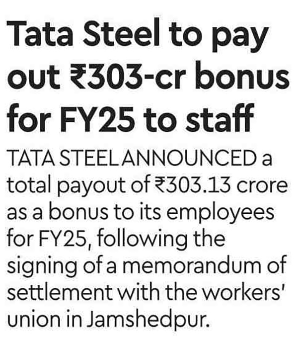 Tata Steel to pay out ₹303-cr bonus for FY25 to staff
