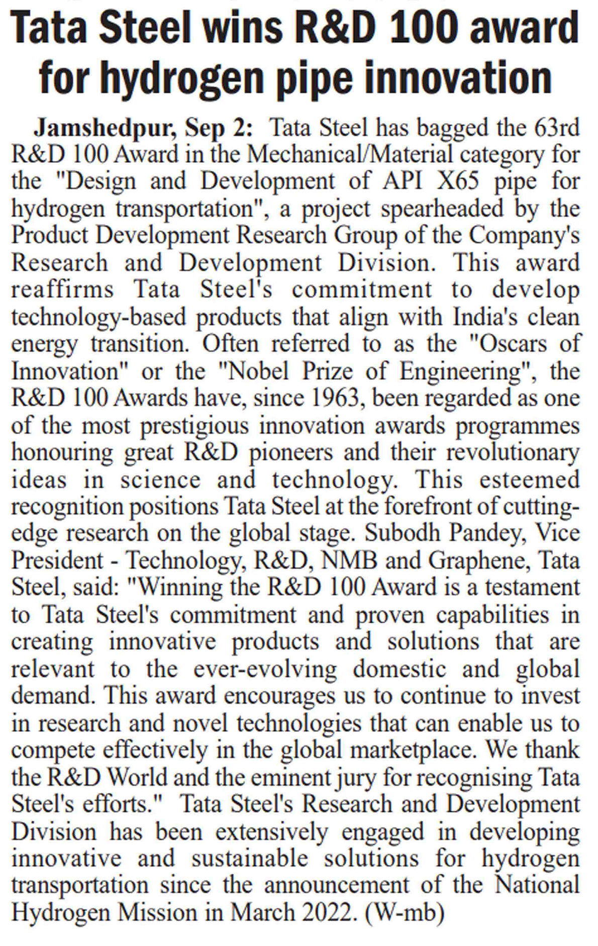 Tata Steel wins R&D 100 award for hydrogen pipe innovation