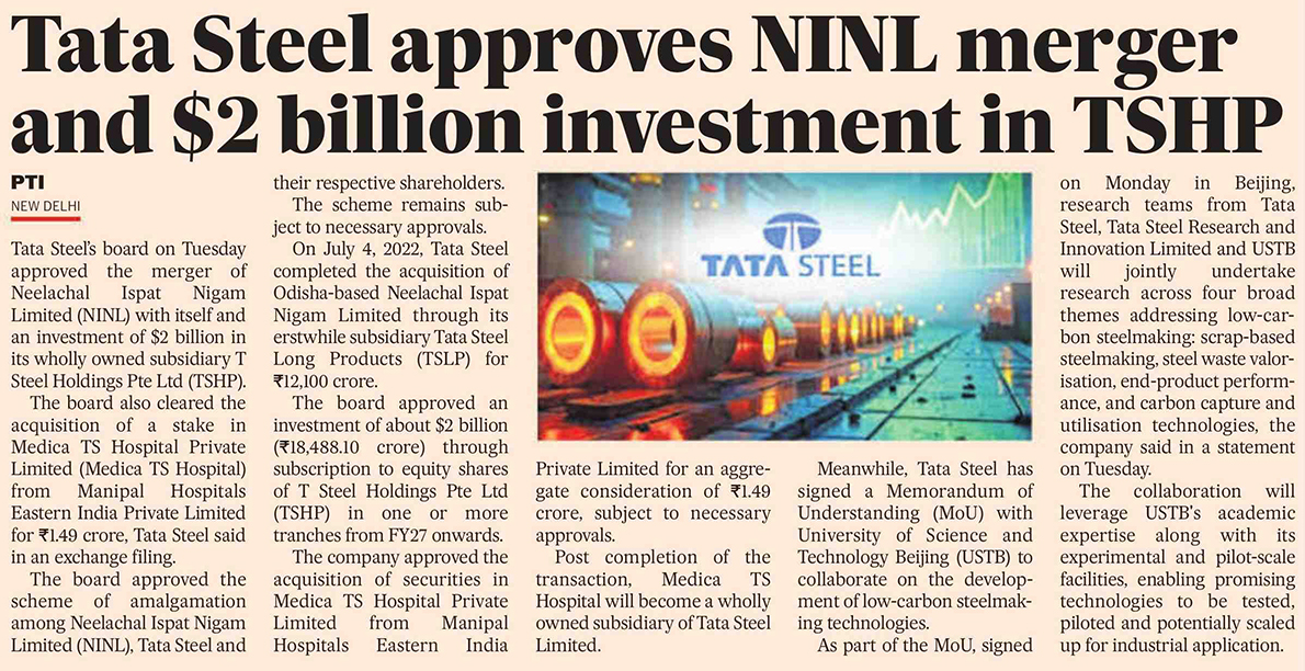 Tata Steel approves NINL merger and $2 billion investment in T Steel Holdings Pte. Ltd.