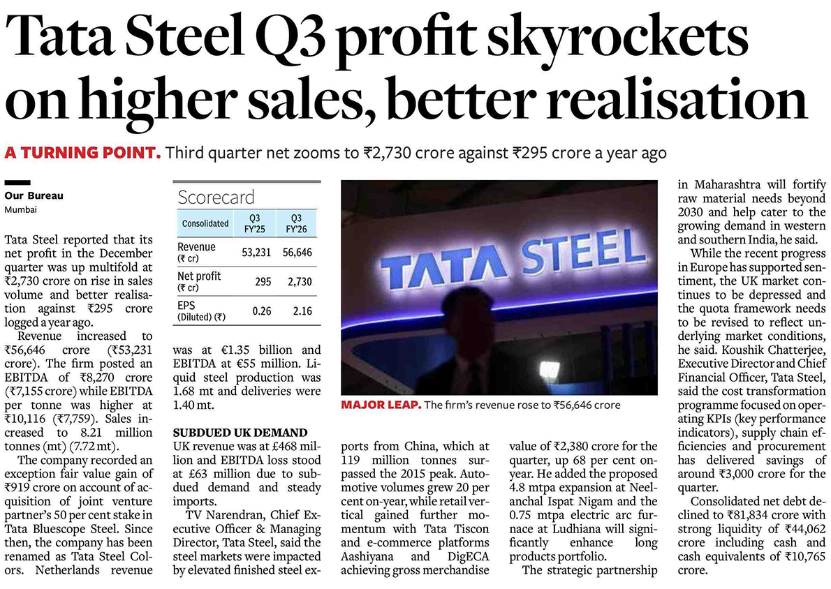 Tata Steel Q3 profit skyrockets on higher sales, better realisation