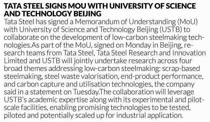 Tata Steel Signs MOU with University Of Science And Technology Beijing