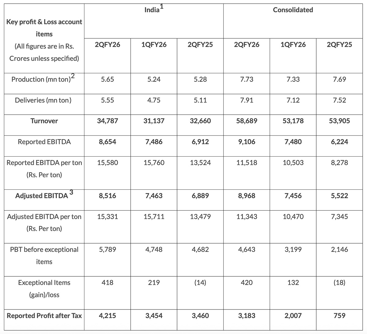 “Tata Steel has continued to perform despite the challenging operating environment. For the quarter ended 30th September 2025, EBITDA margin improved by 145 bps QoQ and 280 bps for the half year, reflecting operational strength and cost discipline. Consolidated revenues for the quarter stood at Rs 58,689 crores, while EBITDA was Rs 9,106 crores, translating to a margin of ~16% or Rs 11,518 per ton. This performance was underpinned by sharp focus on cost transformation program, which delivered around Rs 2,561 crores for the quarter and around Rs 5,450 crores for the half year. India performance has been aided by strong growth in volumes. NINL, our strategic lever to expand in long products business, generated EBITDA, of around Rs 260 crores. Netherlands EBITDA was higher by €28 million QoQ, as we make progress on restoring competitiveness. However, UK EBITDA declined by £24 million on QoQ basis due to subdued prices on account of UK safeguard quotas exceeding prevalent demand. We remain focused on volume growth in India, strengthening our raw material linkages and optimising capital allocation. We are closely monitoring policy developments in EU and UK and will look to prioritise, optimise and sequence the decarbonisation capex spend such that it is affordable to all stakeholders. Overall, operating cash flows before capex and dividend were ~Rs 7,000 crores and we have spent Rs 3,250 crores towards capital expenditure in the quarter and Rs 7,079 crores during the half year. In line with efforts to optimise debt portfolio, we have reduced TSUK debt by £540 million during the quarter and our consolidated gross debt has decreased by around Rs 3,300 cores QoQ to Rs 95,643 crores. On 12th November, Tata Steel executed a share purchase agreement with BlueScope Steel to acquire the balance 50% stake in Tata BlueScope Steel Private Limited. This is in line with our objective to grow the downstream portfolio. Following the acquisition, TBSPL will become a 100% subsidiary of Tata Steel. We remain committed to operational excellence, cost optimisation, and disciplined working capital management to maximise cash flows.”